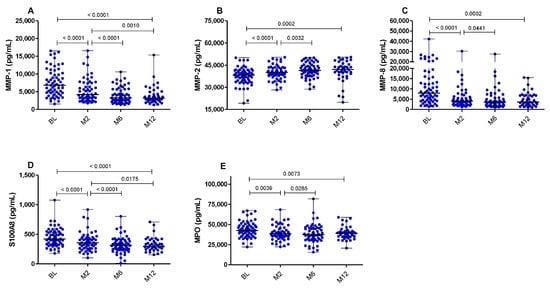 First, we analyzed the plasma concentrations of the inflammatory biomarkers (MMP-1,-2,-8, S100A8 and MPO) over the course of TB treatment within the whole cohort, regardless of HIV status or clinical outcomes. The concentration of MMP-2 moderately increased during the 6 months of TB treatment (median: 38,290.0 pg/mL at BL versus 40,080.0 pg/mL at M2 (p < 0.0001) and 41,450.0 at M6 (p = 0.0032)) but did not change between months 6 and 12 (median: 41,450.0 pg/mL versus 42,030.0 pg/mL, p = 0.4417) (Figure 1B). In contrast, consistent with the results reported by Muefong et al. (2021) [29], the overall plasma concentrations of MMP-1, MMP-8, S100A8 and MPO were significantly reduced from BL to months 6 and 12. These reductions were most pronounced at 2 months after TB treatment initiation, while the concentrations of these analytes did not change between months 6 and 12 (Figure 1A,C–E).