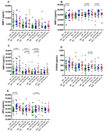 Comparisons of neutrophil-related inflammatory biomarkers MMP-1 (A), MMP-2 (B), MMP-8 (C), S100A8 (D) and MPO (E) between TB mono-infected (n = 21, green dots), HIV/TB coinfected patients on ART (n = 23, blue dots) and HIV/TB coinfected ART-naïve patients (n = 19, red dots) at baseline, month 2, month 6 and month 12 study visits. The magenta dots are the subjects with drug-resistant TB. Bars represent the median and interquartile range. The Mann–Whitney test was used for comparisons between the groups at different time points. p < 0.05 was considered significant.