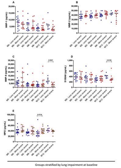 Comparisons of plasmatic biomarkers based on spirometry results from before TB treatment or on day 14: MMP-1 (A), MMP-2 (B), MMP-8 (C), S100A8 (D) and MPO (E) at baseline (n = 29), month 2 (n = 29), month 6 (n = 30) and month 12 (n = 17) between less (n = 16, blue dots) and more severe (n = 18, red dots) lung impairment. The more and less severe lung-impaired patients are represented by red and blue circles, respectively. The magenta dots represent the subjects with drug-resistant TB. Bars represent the median and interquartile range. Mann–Whitney tests were used for comparisons between the groups at different time points. p < 0.05 was considered significant.