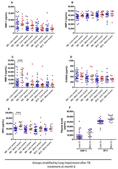Interestingly, before TB treatment initiation, patients with more severe lung impairment after TB treatment at month 6 had higher levels of MMP-8 and MPO compared to those with less severe lung impairment, p = 0.016 and p = 0.001, respectively. After TB treatment initiation, the levels of these two biomarkers were comparable between the two groups, although at months 2 and 6, MPO tended to be higher in the more severe compared to the less severe lung-impaired patients (Figure 4C,E). The levels of S100A8 were also comparable between subjects with more and less severe lung impairment (Figure 4D).