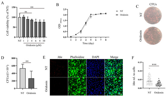 Ori inhibits Mm infection in A549 cells. (A) The cytotoxicity of Ori (1, 2, 4, 6, 8, and 10 μM) on A549 cells, “ns” representative no significance, (n = 6. (B) The growth performance of Mm was assessed after treatment with 2 μM Ori for 7 d. (C) Pretreatment of A549 cells with Ori for 1 h followed by infection with Mm for 6 h. We collected and disrupted the cells using Triton X-100. The lysate of A549 cells was diluted by one hundred times and subsequently coated on 7H10 agar plates. MOI is 10. (D) Quantification of CFUs results (n ≥ 6). (E) After treatment the A549 cells with 2 μM Ori, immunofluorescence analysis reveals Mm entry into A549 cells. The MOI of Mm is 10. Magnification shown is 20×, and the scale bar represents 50 μm. (F) Using Image J quantified Mm immunofluorescence intensity in images of Mm infected A549 cells and calculated the area of Mm/the area of the cell nucleus, each dot representing one image (n ≥ 36). The results shown are means ± SEM, ** p < 0.01, and *** p < 0.001.
