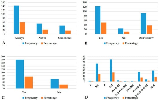 Descriptive analysis of the exposure of respondents and ticks in the farming region of Sindh: (A). Checked body for ticks after handling the tick-infested animals; (B). Humans can get diseases from the tick bites; (C). Bitten by ticks; and (D). Clinical symptoms of F = fever; NS = No symptoms; P = Pain; P + I = Pain and irritation; P + I + F + H = Pain, irritation, fever, and headache; P + I + F + H + NS = Pain, irritation, fever, headache, and no symptoms; P + I + NS = Pain, irritation, and no symptoms; P + I + R + S = Pain, irritation, rash, and swelling around bite; P + I + R + S + F + H = Pain, irritation, rash, swelling around bite, fever, and headache; and R + S = Rash and swelling around bite.