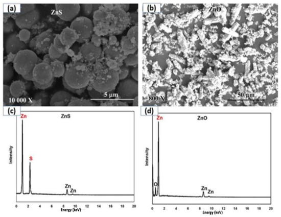 SEM analysis (a,b) and EDX characterization (c,d) of ZnO and ZnS nanoparticles.