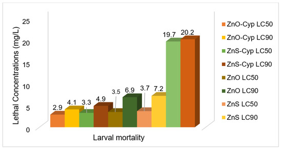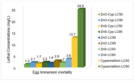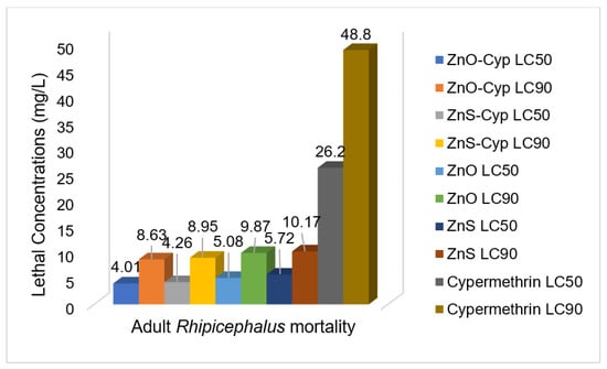 Taken together, the promise of Cyp-ZnO NPs against Rhipicephalus ticks in vitro was higher compared to Cyp-ZnS NPs. Similarly, the uncoated nanomaterials of ZnO showed lower lethal concentrations compared to the ZnS-NPs-treated group and the highest lethal concentrations were observed in the cypermethrin-treated group.