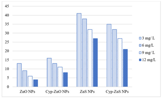 Since Cyp-coated ZnS had mild genotoxic effects, chromosomal bridges, breaks, and c-mitosis were the chromosomal aberrations observed. From a toxicity analysis, it can be presumed that the nanoparticles of ZnO and ZnS were found to be having minimum to mild toxicity effects as observed by chromosomal aberrations and DNA damage in the onion model. Similarly, the cypermethrin-coated nanomaterials of ZnO and ZnS showed minimum to mild toxicity effects compared to the mild–moderate toxicity effects exhibited by cypermethrin alone.