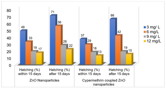 Percentage hatching of tick larvae against ZnO nanoparticles alone and in combination with cypermethrin within 15 days and after 15 days post-treatment.