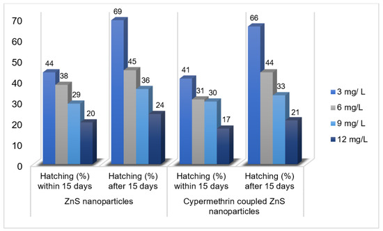 The tests were executed on eggs obtained from ovipositioning females after 3–5 days of egg laying. About 200 eggs (approximately weighing 0.01 g) were placed in 500 µL of test acaricide for 5 min. The eggs were treated for each concentration and at least three replicates of each test concentration (3 mg/L, 6 mg/L, 9 mg/L, and 12 mg/L) were used. The test solutions were decanted off and tubes containing treated eggs were allowed to dry [17]. The test tubes were closed with cotton plugs and incubated at 27–28 °C at 70–80% relative humidity. Egg laying and hatching into larvae (hatching%) were the criteria for estimation of nanoparticle efficacy within observation time of 15 days and after 15 days: