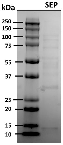 The total protein concentration of the SEPs was measured using Bradford’s method with Bradford Reagent (2-D Quant Kit-GE, Cytiva Marlborough, MA, USA) and bovine serum albumin (BSA) solution as a standard [26]. Samples of SEPs before and after dialysis were separated using sodium dodecyl sulfate-polyacrylamide gel electrophoresis (SDS-PAGE). A total of 20 µL of SEPs (5–10 μg/mL) was loaded on precast gels (Bio-Rad, Hercules, CA, USA) for a 12% Tricine SDS-PAGE. After electrophoresis, the gel was stained with 0.1% Coomassie Brilliant Blue (Bio-Rad, Hercules, CA, USA) for 45 min, followed by destaining. The PageRuler™ Prestained Protein Ladder, 10 to 180 kDa (Bio-Rad, Hercules, CA, USA), was included to estimate the molecular size of the protein bands.