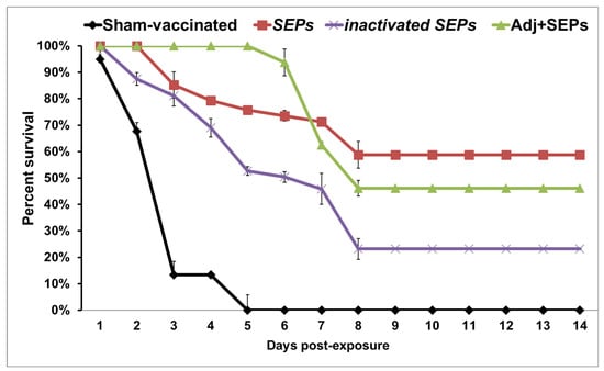 Percent survival of channel catfish fingerlings immunized with the SEPs, heat-inactivated SEPs, or SEPs emulsified with adjuvant (Adj + SEPs) and challenged with F. covae 94-081 strain at 21 days post-exposure. Data are presented as mean ± SE of four replicate tanks.