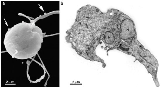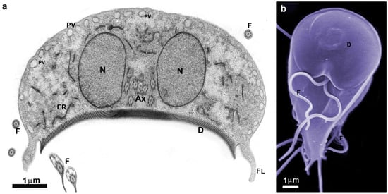 In Giardia, the eight flagella consist of anterior, posterior, ventral, and caudal flagella (Figure 2 and Figure 3b) [7]. These flagella are believed to contribute to the parasite’s motility in multiple directions and help in the adherence of trophozoites to the host’s intestinal epithelial cells [8,9].