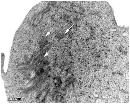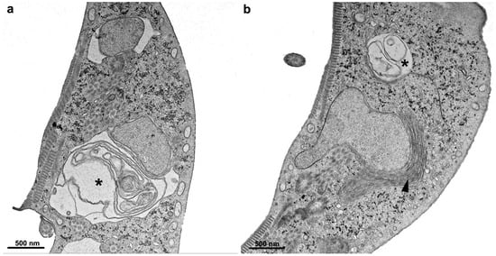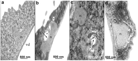 Peripheral vesicles are organelles positioned just beneath the plasma membrane, with dimensions of approximately 150–200 nm (Figure 3a). These vesicles correspond to the endosomal–lysosomal systems found in other eukaryotic organisms [16]. Apart from their involvement in endocytic processes, these vesicles also contain multivesicular bodies, indicating a potential functional role in exocytic activity [17].