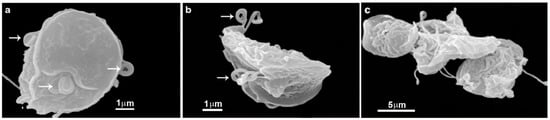 G. intestinalis treated with 50 µM oryzalin for 24 h. The parasites present shortening and curling of the flagella (arrows in (a,b)) and blockage of the cell division process (c). Reproduced from [61].