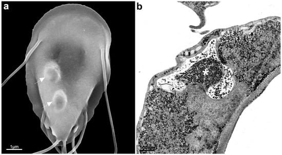 Scanning electron microscopy of G. intestinalis after treatment with nitazoxanide at 1 µg/mL (a) and 3 µg/mL (b) for 24 h. It is possible to note plasma membrane blebbing (a) and damage in the ventral disc (arrow) (b). Reproduced from [48].