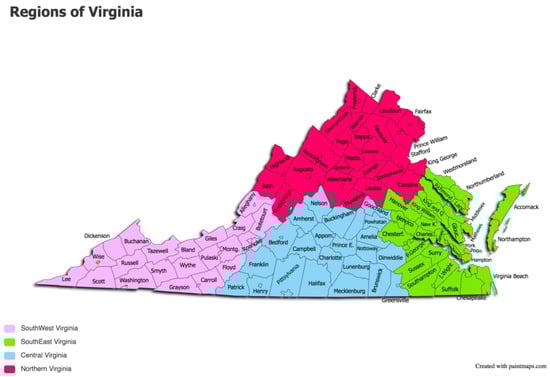 The study sample consisted of a total of 63 equids submitted for necropsy to diagnostic labs in 5 different pre-determined regions of Virginia from January 2020 to March 2021. The pre-determined regions of Virginia were Northern Virginia (NVA), Southwest Virginia (SWVA), Central Virginia, Southeast Virginia (SEVA), and the Outskirts (OVA) (see Figure 1). Inclusion criteria included horses and mules over the age of 2 years that did not have signs of acute respiratory or neurologic disease that could have been due to EHV-1.