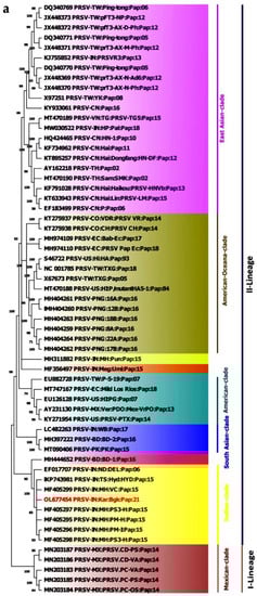 The second phylogenetic analysis of PRSV isolates is based on the deduced aa of the polyprotein, in which PRSV isolates are divided into two lineages (Figure 3a); Mexican lineage had only five isolates of Mexican origin. Whereas another lineage is composed of five clusters, viz., East-Asia, American-Oceana, America, South-Asia, and India. There were three subclusters within the clusters, and the sole member is present in the subcluster, i.e., MH311882, MF356497, and MH444652. The present isolate (PRSV-BGK:OL677454) falls in the Indian-clade with seven other India isolates, including PRSV-HYD (KP743981), with which it is closely clustered, even when the nt sequences were analyzed.