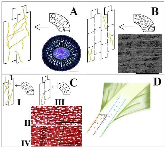 Schematization of the pathogen spread (represented in brown color) in the xylem tissue of susceptible or resistant plants: (A) xylem of the Phaeomoniella chlamydospora–susceptible grapevine cultivar Thompson Seedless, characterized by wide and long xylem vessels (photo from [100], bar = 1 mm); (B) xylem of the Ophiostoma ulmi–tolerant elm hybrid Dodoens, capable of a fast reaction to infection that includes the formation of much smaller vessels and an increase of their density (photo from [101], bar = 500 μm); (C) comparison of the xylem between the Raffaelea lauricola–susceptible avocado cultivar Simmonds (I and II) and the resistant one Duke (III and IV), in which besides differences in vessel length and diameter (C I and C III), any significant difference in the vessel’s density and organization is reported (photo from [102], bar = 1500 μm); (D) vessel ending (red) at the petiole level, which acts like filter for emboli and pathogens, especially at the junction between leaf and stem; adjacent long and open vessels (blue) can facilitate the circulation of emboli or pathogens.