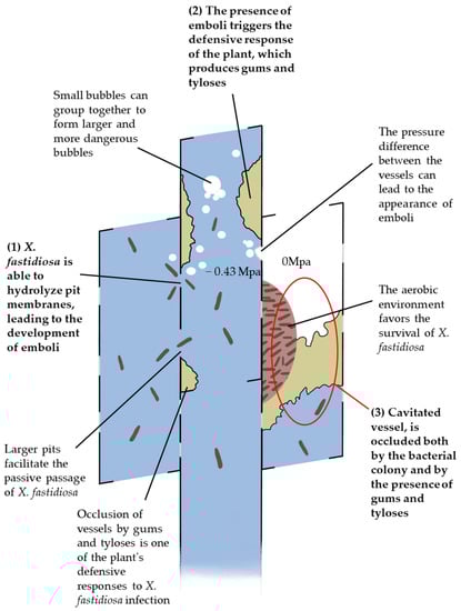 The cavitation process in xylem vessels infected by X. fastidiosa: (1) X. fastidiosa can move actively between vessels by hydrolyzing pit membranes; (2) this can lead to the production of emboli, which seem to stimulate the defensive response of the plant that starts to produce gums and tyloses, as well as those induced by the pathogen; (3) in the most advanced infection stages, gums, tyloses, and bacterial colonies can occlude the vessels, causing cavitation, which favors the survival of the pathogen.