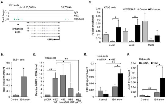 To characterize the mechanism through which HBZ upregulates NRP1 transcription, we first analyzed ChIP-seq data from the Nakagawa et al. study [52]. In the two cell lines examined in this study, a peak of HBZ enrichment was identified approximately 50 kb downstream of NRP1 (Figure 3A). This site is also 176 kb upstream of ITGB1 (Figure S3A); however, the expression of this gene is not affected by HBZ according to microarray data. To test for HBZ enrichment at this site in another HTLV-1-infected T-cell line, we performed ChIP assays using SLB-1 cells. As antibodies against HBZ that are suitable for ChIP assays have not been developed, cells were transduced to express HBZ with a C-terminal 6xHis epitope tag for immunoprecipitation. From this approach, we observed significant enrichment of HBZ at the peak region identified in KK1 cells compared to a downstream off-target region (Figure 3B). These results support our analysis of data from the previous study, showing that HBZ is recruited to a chromosomal region downstream of the NRP1 gene. A general analysis of this region using the UCSC genome browser revealed that it is denoted as an enhancer independent of HBZ and HTLV-1 infection [57,58]. Specifically, it shows hypersensitivity to DNase I and is flanked by peaks of histone H3 lysine 27 (H3K27ac; Figure S3). Given that we did not confirm this region as a bona fide enhancer in an enhancer-based-reporter assay, it is necessary to deem this region as a candidate enhancer (herein referred to as an enhancer).