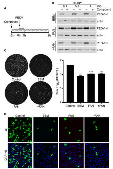 Our data showed that BBM, FAN, and +FAN inhibited PEDV infection mainly at the early stage and hardly affected viral binding to cells. Therefore, whether BBM, FAN, and +FAN inhibited PEDV during the entry stage was investigated in the present study. The PEDV entry assays were performed as shown in Figure 5A. PEDV virions were bound to the cell membrane of Vero-E6 cells at 4 °C, then fresh DMEM, with or without BBM, FAN, and +FAN, was added at 37 °C for 2 h. Next, non-internalized PEDV virions were removed using the citrate buffer. The Western blotting results revealed that the PEDV-N protein levels decreased after BBM, FAN, and +FAN treatments compared with that after DMSO treatment (Figure 5B). These results suggested that BBM, FAN, and +FAN exerted an antiviral effect during the viral entry stage.