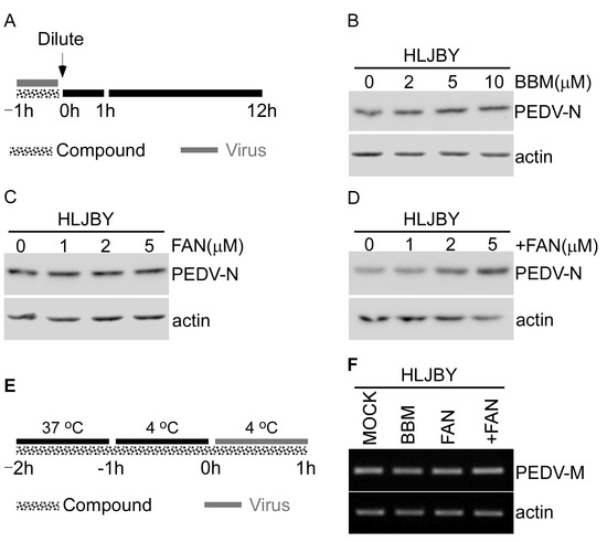 BBM, FAN, and +FAN did not target PEDV particles directly. (A) The overall scheme for Vero-E6 cells infection and treatment with BBM (0, 2, 5, and 10 μM), FAN (0, 1, 2, and 5 μM), and +FAN (0, 1, 2, and 5 μM). PEDV, HLJBY strain (one MOI) was mixed with BBM, FAN, and +FAN for 1 h at 37 °C. Then, the mixture was diluted in 2 mL DMEM and incubated with Vero-E6. (B–D) The protein sample was harvested at 12 h.p.i., and the PEDV-N and actin protein levels were determined by Western blotting. (E) An overall scheme for PEDV infection and treatment with BBM (10 μM), FAN (5 μM), and +FAN (5 μM). The gray solid line refers to the PEDV infection period. The dotted gray line refers to the BBM, FAN, and +FAN treatments. (F) Vero-E6 cells were pretreated with BBM, FAN, and +FAN for 2 h (1 h at 37 °C and another at 4 °C), infected with PEDV, HLJBY strain (one MOI), and then treated with BBM, FAN, and +FAN for 1 h at 4 °C. Finally, the cells were washed with cold PBS to wash out the unbound virus, followed by RT-PCR assay to determine the levels of PEDV-M and actin mRNA.