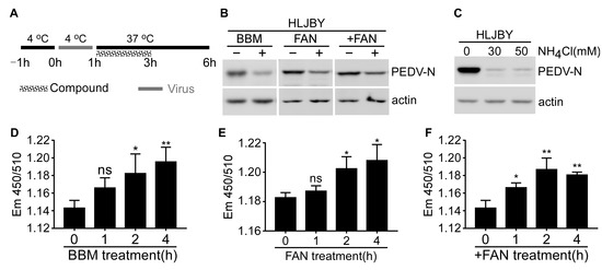 BBM, FAN, and +FAN inhibited PEDV entry by suppressing endo-lysosome acidification. (A) The overall scheme for PEDV infection and treatment with BBM (10 μM), FAN (5 μM), and +FAN (5 μM). The gray solid line refers to the PEDV infection period. The dotted gray line refers to the BBM, FAN, and +FAN treatments. (B) Vero-E6 cells were infected with PEDV, HLJBY strain (one MOI) at 4 °C. After infection, the cells were treated with BBM, FAN, and +FAN for 2 h at 37 °C and washed thrice with citrate buffer, followed by incubation in fresh DMEM for 3 h. Finally, the protein sample was harvested, and the levels of PEDV-N and actin protein were determined by Western blotting. (C) Vero-E6 cells were infected with PEDV, HLJBY strain (one MOI) at 4 °C. After infection, the cells were treated with NH4Cl (0, 30, and 50 mM) for 2 h at 37 °C and washed thrice with citrate buffer, followed by incubation with fresh DMEM for 3 h. Finally, the protein sample was harvested, and the levels of PEDV-N and actin protein were determined by Western blotting. (D–F) The Vero-E6 cells were treated with BBM, FAN, and +FAN for 0, 1, 2, and 4 h, and then labeled with 2 μM lysosensorTM yellow/blue DND-160 for 3 min at 37 °C. The excess dye was removed with cold PBS and then transferred to DMEM. The emission ratio at 451/510 nm was measured at excitation-365 nm. The results were analyzed by Student t-test (*, p < 0.05; **, p < 0.01; ns, p > 0.05).