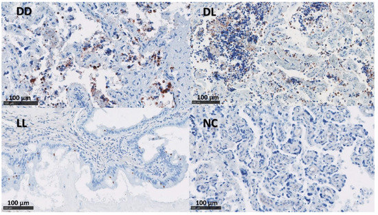 The presence of C. abortus in the tissue sections was confirmed using a mAb (4/11) specific to C. abortus MOMP [33] (Figure 2 and Figure 3). No positive samples were found in the NC group. The median of the percentage for MOMP immunolabelling in groups DD, DL, and LL varied between 11.5 and 24.5% in the placentae and between 1 and 10% in the uteri (Figure S2 and Table 4).