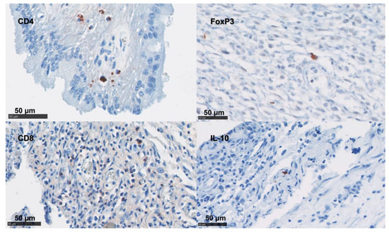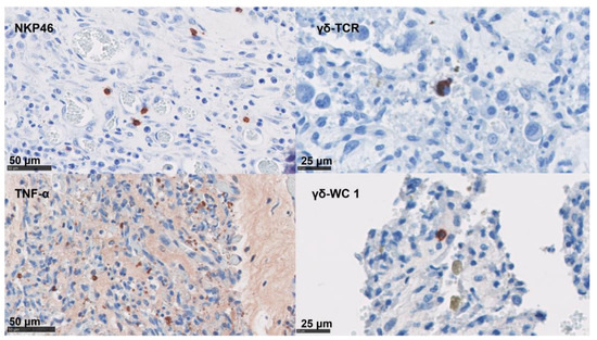 In the placentae, the infiltration of CD4 T cells, CD8 T cells, γδ-T cells, and NK cells were occasionally present in small numbers or in single cells (Figure 5 and Table 4). By contrast, immunolabelling for TNF-α, IL-10, and FoxP3 showed slightly higher cell counts in our samples (Figure 5 and Table 4). The detection of mRNA for IFN-γ and IL-17A was nearly absent in the NC tissues (Table 4).