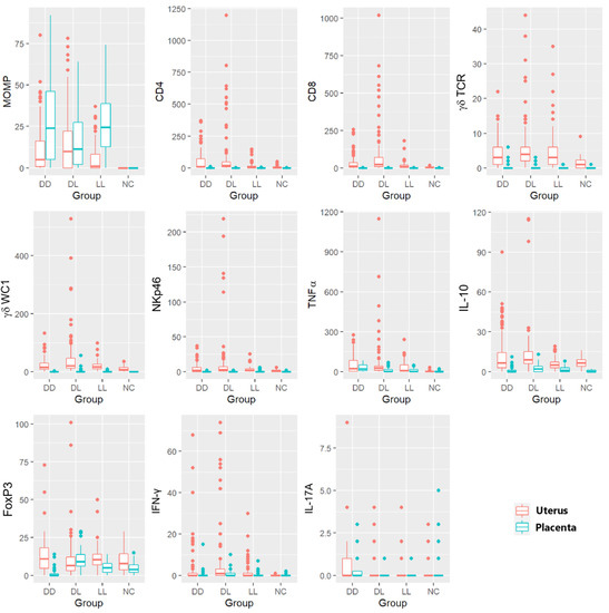 Box and whisker plots showing the multiple comparisons of immune markers and the C. abortus marker in the uteri and placentae. Different markers for IHC (C. abortus MOMP, CD4 T cells, CD8 T cells, γδ-T cells (γδ-TCR and γδ-WC1), NKp46, TNF-α, IL-10, FoxP3) and ISH (IFN-γ and IL-17A) in different ewe outcome groups (DD, DL, LL, and NC). Every boxplot identifies the uteri in orange and the corresponding placentae in light blue for each group of animals. Boxes in the plots are shown using the first quartile (bottom line of the box), median (central line in the box), and third quartile (upper line of the box). The whiskers (vertical lines) show a measure in the range, which could be extended to the most extreme data point no more than 1.5 times the interquartile range from the box. Outlier data are shown as solid points.