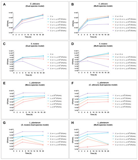 Dynamic changes in the viable cells of C. albicans, S. mutans, and L. plantarum in mono-, dual-, and multi-species models. (A,B) C. albicans viable cells in dual- and multi-species conditions. (C,D) S. mutans viable cells in dual- and multi-species conditions. (E) L. plantarum viable cells in mono-species condition. (F) L. plantarum viable cells in C. albicans presence dual-species condition. (G) L. plantarum viable cells in S. mutans presence dual-species condition. (H) L. plantarum viable cells in multi-species condition. Overall, dose-dependent antimicrobial and antifungal effects were seen for L. plantarum; 108 CFU/mL of L. plantarum showed inhibition on the growth of C. albicans and S. mutans. The dotted line represents the control groups in each model.