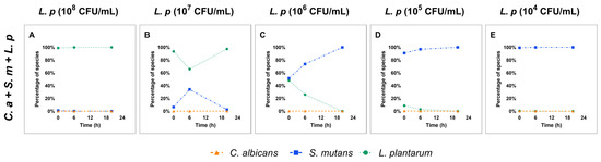 Changes in species composition in multi-species. The composition of each microorganism in multi-species condition is shown. (A–E) The composition of C. albicans, S. mutans, and L. plantarum in multi-species condition.