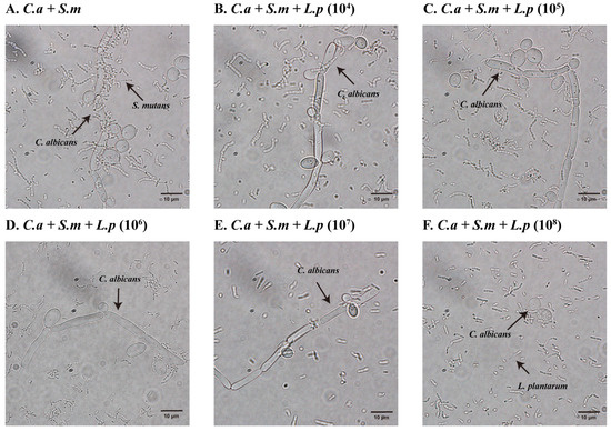 Dose-dependent inhibition of C. albicans hyphae formation by L. plantarum gene in multi-species model at × 100 magnification. (A) S. mutans and C. albicans grown in dual-species model at 20 h. (B–F) S. mutans and C. albicans grown with addition of various doses of L. plantarum at 20 h. The addition of 108 CFU/mL L. plantarum inhibited the growth of C. albicans and the transition from yeast to hyphae or pseudohyphae form. These are representative images of multiple fields of view.