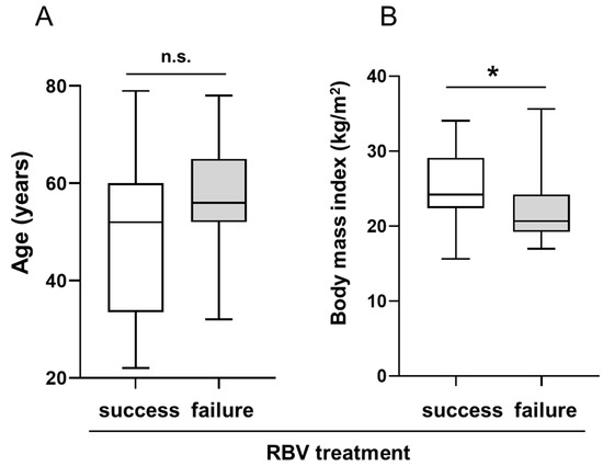 Impacts of age and body mass index (BMI) of ribavirin (RBV) treatment outcome in kidney transplant recipients (KTRs) with HEV infection. (A) KTRs with higher age showed a non-significant trend toward more frequent RBV treatment failure vs. treatment success (p = 0.054). (B) A lower BMI correlated significantly with a higher rate of RBV treatment failure. n.s.—not significant, * p < 0.05.
