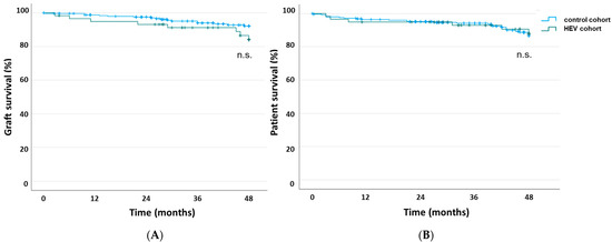 Kaplan–Meier estimates of allograft survival (A) and patient survival (B) in KTRs with HEV infection (green line) vs. KTRs without HEV infection (blue line) after diagnosis of hepatitis E or after diagnostic testing (control cohort). n.s.—not significant.