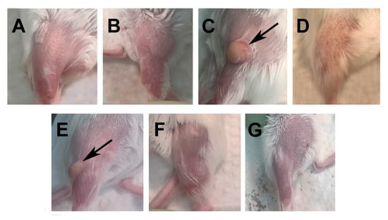 Evaluation of the reactogenicity/toxicity at the site of vaccination. Before the mice were euthanized, pictures were taken of the site where the vaccines were delivered. (A) No injection control; (B) PBS control; (C) CpG-1826+Mont/MOMP; (D) IVAX-1/MOMP; (E) CpG-1018+Mont/MOMP; (F) IVAX-2/MOMP; (G) MOMP only.