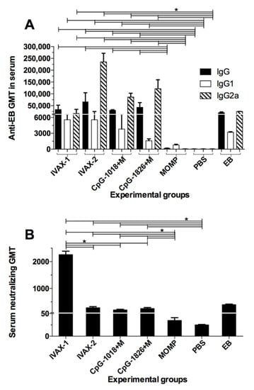 The in vitro neutralizing antibody GMT in the serum was determined the day before the challenge (Figure 2B). Serum collected before immunization was used as the negative control. The in vitro neutralization GMT in mice immunized with EBs was 400, while for the MOMP only and PBS-vaccinated groups, it was below the level of detection (<50). The highest in vitro neutralization GMT was observed in the mice vaccinated with IVAX-1 (2263). The other three experimental groups had GMTs ranging from 200 to 283, significantly lower than the titer elicited by IVAX-1 (p < 0.05).