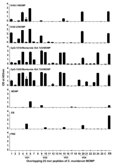 Binding of serum antibodies from immunized mice to synthetic C. muridarum MOMP peptides. Serum samples from mice were collected the day before the i.n. challenge. Their reactivity to 25-aa overlapping peptides corresponding to the C. muridarum mature MOMP was analyzed by ELISA.
