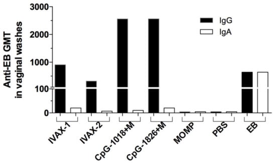 To determine mucosal IgG and IgA antibody titers to EBs, vaginal washes were collected and pooled (Figure 4). For the four groups immunized with MOMP, the IgG titers were low and the IgA titers were below the level of detection. EB-immunized mice had similar levels of IgG and IgA.