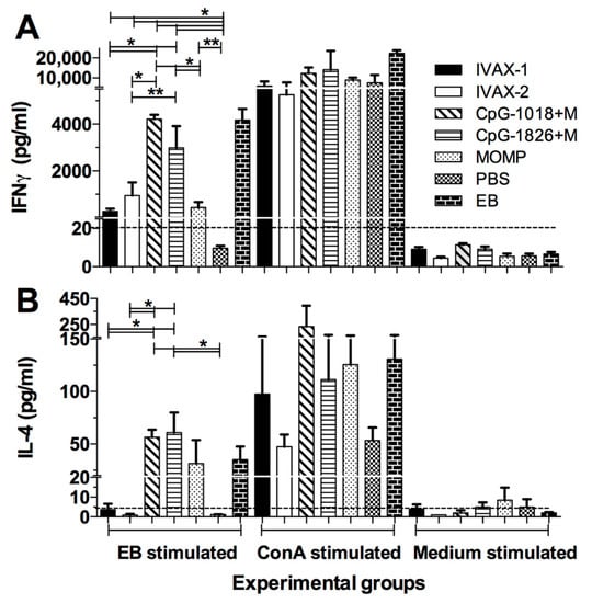 Determination of (A) IFN-γ and (B) IL-4 levels in T-cell supernatants collected from vaccinated mice the day before the i.n. challenge. The day before the intranasal challenge, four randomly selected mice from each group were euthanized, their spleens collected, and T-cells isolated using nylon wool columns and stimulated with C. muridarum EBs, with Concanavalin A as a non-specific stimulant, or with medium as a negative control. * p < 0.05 and ** p < 0.1 by the Student’s t-test. The limit of detection is indicated with a broken horizontal line.