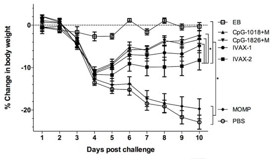 As a measurement of the systemic effect, the body weight was determined for 10 days following the i.n. challenge with 104 inclusion-forming units (IFUs) of C. muridarum. Except for the positive control group immunized i.n. with live EBs, all the mice lost weight from day two to four p.c. (Figure 6). Subsequently, in contrast to the mice immunized with MOMP only or PBS, the animals vaccinated with adjuvanted C. muridarum MOMP slowly regained most of their initial body weight. As determined by the repeated-measures ANOVA, the cumulative body weight changes over the 10 days were significantly different between the mice immunized with C. muridarum MOMP and adjuvant combinations and the two negative control groups receiving MOMP only or PBS (p < 0.05). The mice immunized with CpG-1018+Mont, CpG-1018+Mont, or IVAX-1 lost less body weight over the 10-day period than the groups immunized with IVAX-2 (p < 0.05).