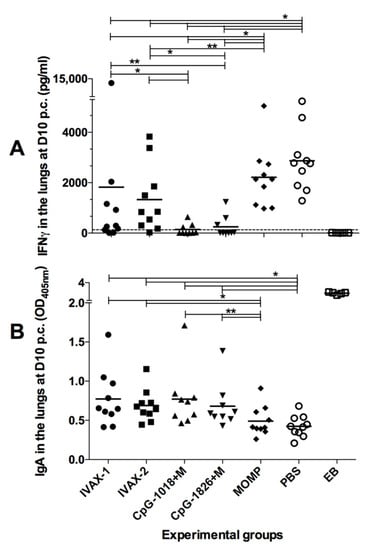 Immune responses in the lungs of mice at 10 d.p.c. (A) IFN-γ levels in lung supernatants at 10 d.p.c. The mean is shown as a horizontal line. Each symbol represents an animal. * p < 0.05 and ** p < 0.1 by the Mann–Whitney U test. (B) C. muridarum-specific IgA levels in lung supernatants at 10 d.p.c. The mean is shown as a horizontal line. Each symbol represents an animal. * p < 0.05 and ** p < 0.1 by the Student’s t-test.