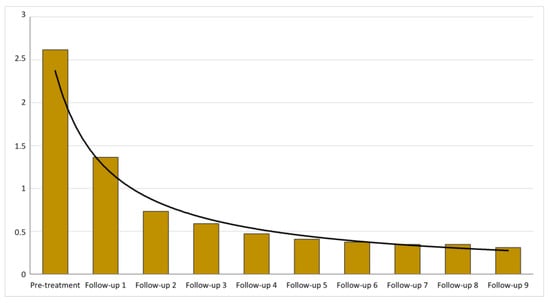 At some point during the follow-up after the first treatment, all examined dogs showed a decreased antibody level (Figure 1). The mean time to achieve a decreased ELISA value after the first treatment was 2.6 (±1.6) months with a minimum of 1.0 and a maximum of 10.5 months.