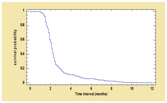 The dogs with improved clinicopathological alterations at some point during follow-up were identified. They were 171 out of the 173 dogs having received the first treatment. The mean time to observe this decrease was calculated: 4.1 (±10.0) months with a minimum of 1.0 and a maximum of 115.3 months. The survival curve below represents the proportion of dogs whose clinicopathological alterations had not improved at time t (Figure 5).
