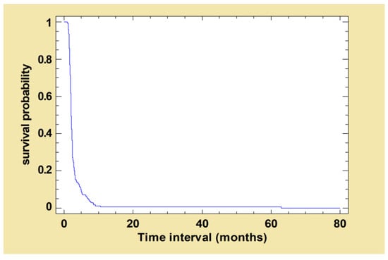 After the first treatment with the MIL-Al protocol, 170 out of the 173 dogs (98.3%) exhibited a clinical improvement at some point during follow-up. The mean time of improvement was calculated: 3.0 (±4.9) months with a minimum of 1.0 months and a maximum of 62.9 months. The survival curve below represents the proportion of dogs whose clinical signs had not improved at time t (Figure 3).