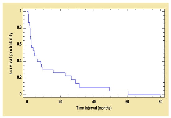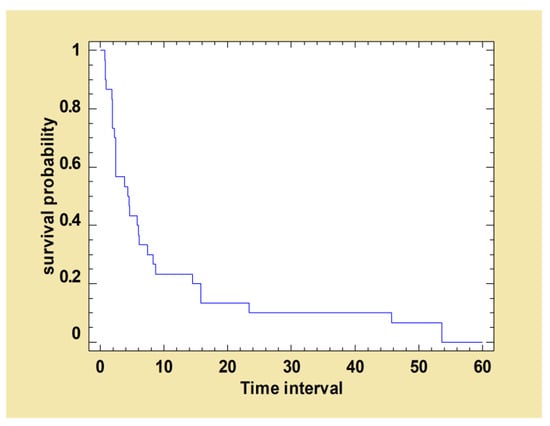 After the second MIL-AL treatment, 28 out of the 30 dogs showed an improvement in clinicopathological alterations at some point during follow-up. The mean time to observe this event was 11.0 (±15.4) months with a minimum of 0.7 and a maximum of 60.6 months. The survival curve below represents the proportion of dogs whose clinicopathological alterations had not improved at time t (Figure 6).