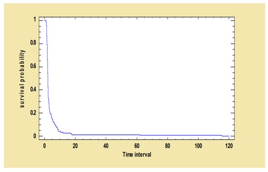 Kaplan–Meier curve: survival function estimated using total clinical score decreased after the first treatment. The following survival curve shows the probability of survival of dogs whose total clinical score had not decreased at time t after the first treatment with MIL-AL.