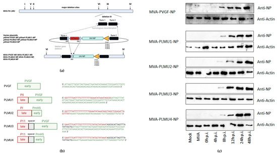 We designed four synthetic vaccinia virus early/late promoters to test their capacity to activate robust NP-specific cellular and humoral responses compared to the strong early natural PVGF promoter. NP gene sequences were introduced into the deletion site III of MVA by homologous recombination, and placed under the control of the newly designed chimeric promoters PLMU1, PLMU2, PLMU3, and PLMU4, as well as the natural PVGF promoter, as already established (Figure 1a,b) [38]. The genetic integrity of the recombinant viruses was confirmed by the PCR analysis of the viral DNA, demonstrating the site-specific insertion of the IAV-NP gene sequence, the absence of non-recombinant MVA, and the proper removal of the mCherry marker gene (Figure S1a). Furthermore, the genetic stability of the recombinant MVA viruses was confirmed by PCR targeting the six major deletion sites and the C7L gene locus of MVA (Figure S1b).