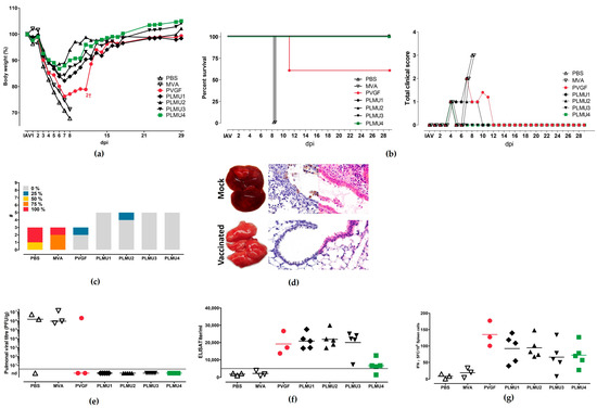 Protective capacity of MVA-PVGF-NP (PVGF, n = 5), MVA-PLMU1-NP (PLMU1, n = 5), MVA-PLMU2-NP (PLMU2, n = 5), MVA-PLMU3-NP (PLMU3, n = 5), or MVA-PLMU4-NP (PLMU4, n = 5) prime-boost immunization against A/Puerto Rico/8/1934/H1N1 infection in C57BL/6 mice. Groups of mice were immunized twice over a 21-day interval with 108 pfu MVA-PVGF-NP, MVA-PLMU1-NP, MVA-PLMU2-NP, MVA-PLMU3-NP, or MVA-PLMU4-NP. Mice immunized with non-recombinant MVA (MVA, n = 3) or saline (PBS, n = 3) served as controls. Four weeks post-booster immunization, mice were infected intranasally with a lethal dose of A/Puerto Rico/8/1934/H1N1 and were monitored for (a) body weight changes and (b) behaviour and general condition in clinical scores. Mice were euthanized 28 days after the challenge or after humane endpoints were reached. At necropsy, (c) percent of lung affected by pneumonia was determined, (d) pulmonal macroscopic and histologic lesions were recorded in routine stain and immunohistochemistry (displaying intact and necrotic epithelia with Influenza antigen), and, additionally, (e) pulmonary viral loads, (f) serum IgG antibodies, and (g) IFN-γ+ spot-forming cells (SFC) were analyzed by ELISPOT.