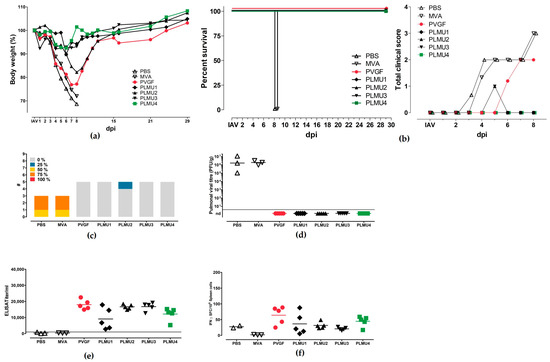 Protective capacity of MVA-PVGF-NP (PVGF, n = 5), MVA-PLMU1-NP (PLMU1, n = 5), MVA-PLMU2-NP (PLMU2, n = 5), MVA-PLMU3-NP (PLMU3, n = 5), or MVA-PLMU4-NP (PLMU4, n = 5) prime immunization against A/Puerto Rico/8/1934/H1N1 infection in C57BL/6 mice. Groups of mice were immunized once with 108 pfu MVA-PVGF-NP, MVA-PLMU1-NP, MVA-PLMU2-NP, MVA-PLMU3-NP, or MVA-PLMU4-NP. Mice immunized with non-recombinant MVA (MVA, n = 3) or saline (PBS, n = 3) served as controls. After 28 d.p.v., mice were infected intranasally with a lethal dose of A/Puerto Rico/8/1934/H1N1 and mice were monitored for (a) body weight changes and (b) behaviour and general condition in clinical scores. Mice were euthanized 28 days after the challenge infection or after humane endpoints were reached. At necropsy, (c) percent affected by pneumonia was determined, and, additionally, (d) pulmonary viral loads, (e) serum IgG antibodies, and (f) IFN-γ+ spot-forming cells (SFC) were analyzed by ELISPOT.