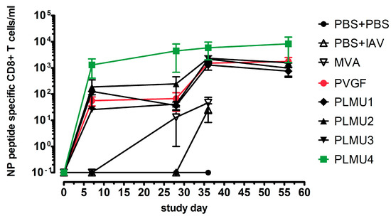 Since all four chimeric promoters induced a protective effect against the lethal IAV challenge and produced comparable antibody and T-cell responses in the first vaccination experiments, we aimed to analyze the activation of peripheral blood NP-specific CD8+ T cell expansion in a next step. Mice were prime vaccinated and challenged 28 d.p.v. The levels of NP-specific CD8+ T cells were analyzed on days 0, 7, 28, 36, and 56 after their initial immunization. The control vaccinated animals did not mount NP-specific CD8+ T cells. In contrast, we confirmed T cell expansion in all MVA-NP-vaccinated animals. In MVA-PVGF-NP-, MVA-PLMU1-NP-, MVA-PLMU2-NP-, and MVA-PLMU3-NP-vaccinated mice, we detected similar levels of NP-specific CD8+ T cells starting on day 36 after the initial vaccination. On day 36, we detected a mean of 1525 NP-specific CD8+ T cells in MVA-PVGF-NP-vaccinated animals, a mean of 1297 NP-specific CD8+ T cells in MVA-PLMU1-NP-, 2326 NP-specific CD8+ T cells in MVA-PLMU2-NP-, and a mean of 2178 NP-specific CD8+ T cells in MVA-PLMU3-NP-vaccinated animals (Figure 4) [54]. These levels remained constant until day 56. Interestingly, in MVA-PLMU4-NP-vaccinated animals, we had already detected NP-specific CD8+ T cells seven days after the initial vaccination, with a mean of 1306 NP-specific CD8+ T cells. These titers further increased until day 28 after the initial vaccination, with a mean of 4448 NP-specific CD8+ T cells. On day 36 post-initial vaccination, the MVA-PLMU4-NP-vaccinated animals mounted a mean of 5867 NP-specific T cells, which then finally maintained with a mean of 8343 NP-specific CD8+ T cells on day 56. These data indicated that MVA-PLMU4-NP induced considerably higher levels of NP-specific CD8+ T cells in the blood.