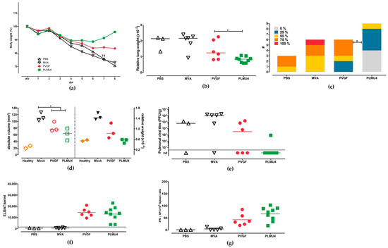 Protective capacity of MVA−PVGF−NP (PVGF, n = 6) or MVA−PLMU4−NP (PLMU4, n = 9) prime immunization against A/Puerto Rico/8/1934/H1N1 infection in C57BL/6 mice. Groups of mice were immunized once with 108 pfu MVA-PVGF-NP or MVA-PLMU4-NP. Mice immunized with non-recombinant MVA (MVA, n = 6) or saline (PBS, n = 3) served as controls. Then, 28 d.p.v., mice were infected with a lethal dose of A/Puerto Rico/8/1934/H1N1 and were monitored for (a) body weight changes. End point of the study was eight days post-challenge. At necropsy, (b,c) relative lung weights and percent affected by pneumonia, as well as (d) quantitative stereological estimation of lung volume affected by pneumonia, were determined; additionally, (e) pulmonary viral loads, (f) serum IgG antibodies, and (g) IFN-γ+ spot-forming cells (SFC) were analyzed. Data were analyzed by Mann–Whitney test unless otherwise indicated. Asterisks represent statistically significant differences: * p < 0.05.